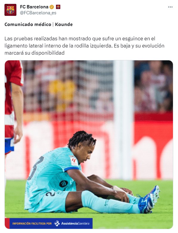 Los compromisos, que le tendrían de baja a Joules Koundé serían los siguientes: FC Barcelona vs Athletic de Bilbao, juego a disputarse el domingo 22 de octubre a las 21:00, seguido de ello el FC Barcelona vs Shakhtar el miércoles 25 de octubre a las 18:45, válido por la tercera fecha de la fase de grupos de la UEFA Champions League y la primera edición de El Clásico en esta temporada, el FC Barcelona vs Real Madrid, el próximo sábado 28 de octubre a las 16:15 en Montjuic.