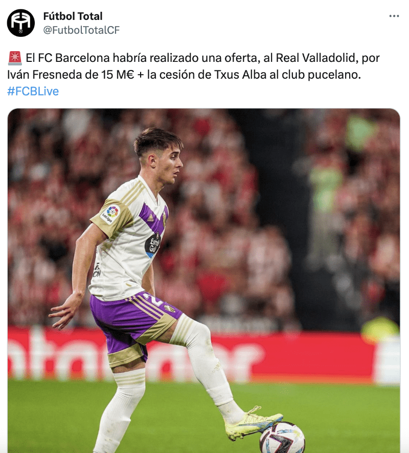 FC Barcelona no se rinde en su aspiración por contratar a un nuevo jugador para la zona derecha y de acuerdo a información de Fútbol Total: “El FC Barcelona habría realizado una oferta, al Real Valladolid, por Iván Fresneda de 15 M€ + la cesión de Txus Alba al club pucelano”. Esto para cubrir el lateral derecho.