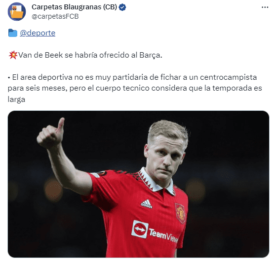 Proveniente de una de las mejores canteras de Europa, el asalto de Donny van de Beek aparece en el horizonte con muy buen síntoma y forma. Curiosamente cedido por el Manchester United, a uno de los equipos que es propiedad de su acérrimo rival, el Manchester City, el mediocentro que en su tiempo llegase a valer cerca de 55 millones de euros, ahora está valorizado en solo 10 millones, y es una de las grandes sensaciones del fútbol español. Ello ha despertado el interés de Deco y de toda la dirigencia para aunar esfuerzos y pensar en la compra del jugador que tiene contrato con los Red Devils hasta el 2025.