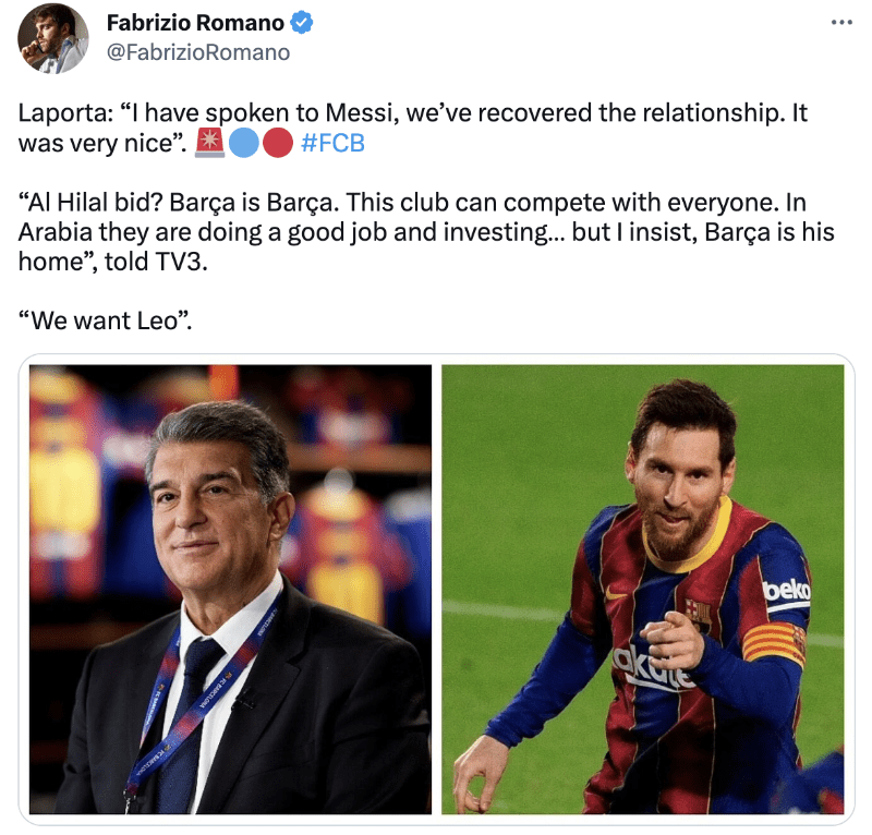 “He hablado con Messi, hemos recuperado la relación. Fue muy agradable... ¿La oferta de Al Hilal? El Barça es el Barça. Este club puede competir con todos. En Arabia están haciendo un buen trabajo e invirtiendo… pero insisto, el Barça es su casa”, dijo a TV3 el presidente del FC Barcelona sobre la vuelta del 10.