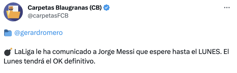 “LaLiga le ha comunicado a Jorge Messi que espere hasta el LUNES. El Lunes tendrá el OK definitivo”, dijo en su transmisión. Con esto se sigue moviendo todas las fichas para que Lionel Messi pueda regresar al FC Barcelona, e incluso a pedido Joan Laporta que los otros fichajes se paren, porque la prioridad ese el argentino.