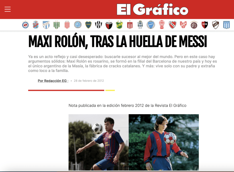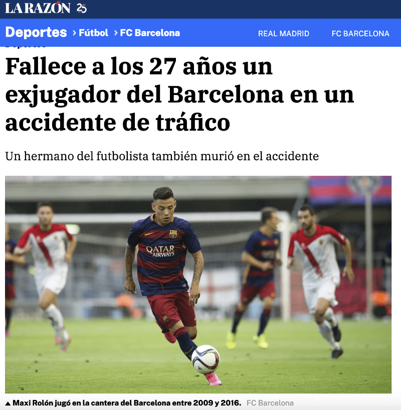 Maxi Rolón fue de las grandes promesas de las canteras del FC Barcelona, sin embargo se vio truncada su carrera de manera inesperada luego de un accidente de tránsito. "El futbolista argentino Maxi Rolón, de 27 años, falleció este sábado en un accidente de tráfico en una carretera cercana a la ciudad de Casilda, provincia de Santa Fe, en Argentina", informó La Razón.