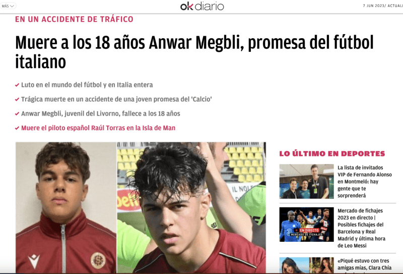 “El Livorno, club en el que jugaba el joven, ha publicado un emotivo tributo para confirmar el fallecimiento de su prometedora estrella. ‘No, no puedes morir a los 18’, comenzaba el comunicado. Megbli era un delantero prometedor en el equipo de la Serie D que fue convocado por la selección en las categorías inferiores”, destacó el medio antes referido.