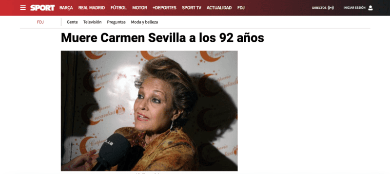 España llora por el sensible fallecimiento de un ícono del país, como fue Carmen Sevilla. “Ha sido uno de los nombres más importantes del panorama nacional en el ámbito de la interpretación. Diagnosticada de Alzheimer en 2009, vivía en una residencia pero la última semana fue ingresada en un hospital de Madrid tras alertar un estado grave de salud”, mencionó Sport.