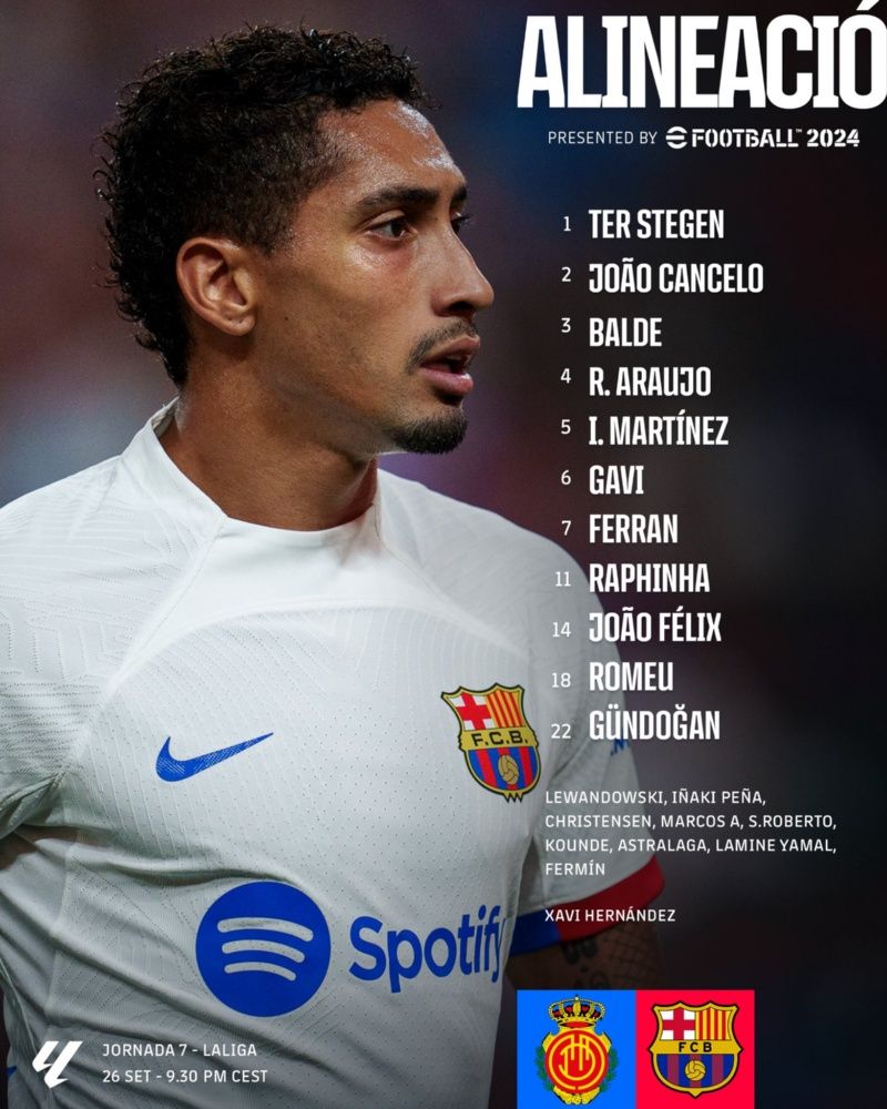 Por lo que el 11 del Barça para enfrentar al Mallorca es el siguiente: Marc-André ter Stegen en la portería y como capitán; la línea de cuatro defensores será compuesta por Joao Cancelo, Ronald Araújo, Íñigo Martínez y Alejandro Balde; en la medular estarán los mismos de siempre con Gavi, Ilkay Gündogan y Oriol Romeu; mientras que el tridente ofensivo será Raphinha y Joao Félix por las bandas y Ferran Torres como ’número 9’, tal y como lo habíamos predicho aquí en el día de ayer.
