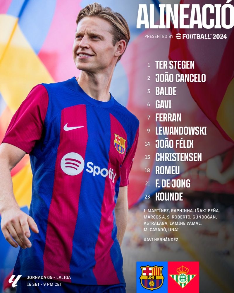La formación del Barça en Montjuïc para recibir al Betis es la siguiente: Marc-André ter Stegen en portería; Joao Cancelo, Jules Koundé, Andreas Christensen y Alejandro Balde en la defensa; Oriol Romeu, Frenkie de Jong y Gavi en la medular; Ferran Torres, Joao Félix y Robert Lewandowski en la delantera. Se vuelve al tridente ofensivo luego de la única prueba en la pretemporada contra el Arsenal y esto era altamente requerido por la afición dado el juego del equipo en los últimos partidos.
