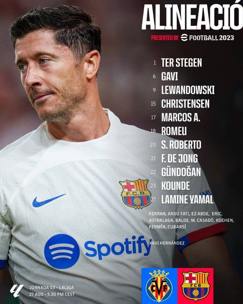 Con todo este contexto, el Barça irá de la siguiente manera ante el Villarreal: Marc-André ter Stegen en la portería; Sergi Roberto, Jules Koundé, Andreas Christensen y Alejandro Balde en defensa; Ilkay Gündogan, Oriol Romeu y Frenkie de Jong en el medio del campo; mientras que en la delantera estarán Gavi, Lamine Yamal y el artillero polaco Robert Lewandowski.