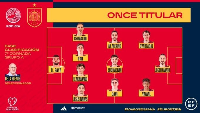 Con todo esto dicho, este es el 11 alternativo de España para enfrentar a Chipre: David Raya estará en portería; Jesús Navas será el lateral derecho, Robin Le Normand y Pau Torres serán los zagueros centrales, mientras que Alejandro Grimaldo estará por izquierda; en la medular estarán Martín Zubimendi, Gavi y Mikel Merino; mientras que el tridente ofensivo será compuesto por el mencionado Lamine Yamal por el extremo derecho, Mikel Oyarzabal por izquierda y Joselu Mato de ’número 9’.