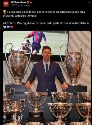 “Felicitaciones a Leo Messi por convertirse en el futbolista con más títulos de todos los tiempos. 44 trofeos, Muy orgullosos de haber sido parte de esa increíble historia”, redactó el club azulgrana en sus redes sociales para con el ídolo más grande de la institución. Y es que era imposible no congratularlo ya que 35 de esos 44 fueron celebrados como jugador blaugrana.