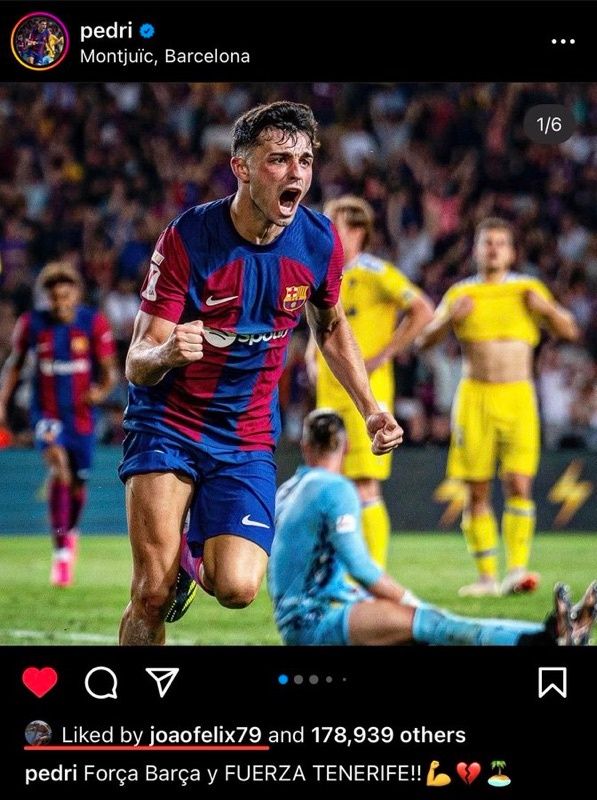 Tras la victoria trabajada y cansada del Barça en el día de ayer ante el Cádiz por 2 a 0 en el Estadio de Montjuïc, Pedri subió una foto suya a su Instagram festejando el gol de la victoria y que abrió el marcador en la tarde-noche de ayer. Pero lo que nadie esperaba es que Joao Félix le diera un corazón a la publicación sin ningún miramiento y con su cuenta oficial.