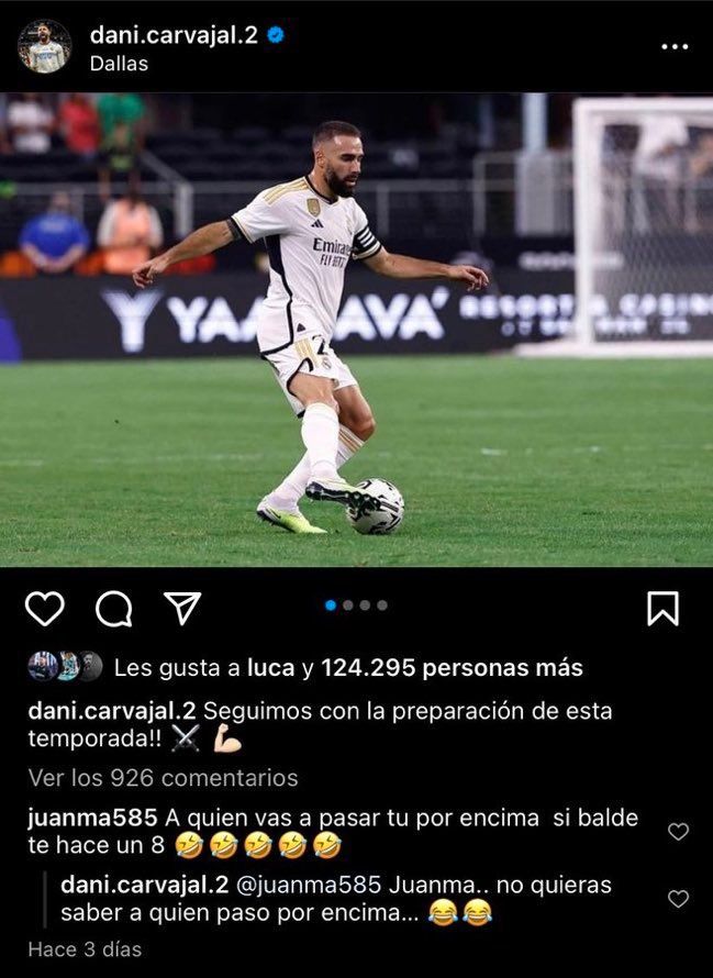 En una publicación en su Instagram personal, Carvajal publicó una foto del partido y con la leyenda de “seguimos con la preparación de este temporada”. Y un hincha del Barça le comentó acerca de sus dichos el pasado día con un “a quien vas a pasar por encima tú si Balde te hace un 8” bastante inofensivo. Pero el lateral no sabe tomar una broma y se tomó las molestias de comentar todo enojado “Juanma… no quieras saber a quien paso por encima”, de lo que no hace falta comentar nada.