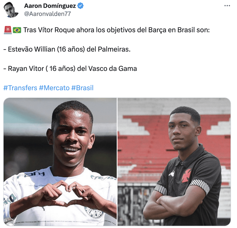 De acuerdo a información de Aaron Domínguez, Estevão Willian de 16 años de edad y que está en las divisiones formativas del Palmeiras, es uno de los objetivos más grandes que tiene el FC Barcelona para ficharlo. Esto luego que Raphinha no ha dado la talla y ya lo buscan equipos de la Premier League como Newcastle.