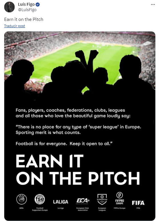 A su mejor estilo y como el pesetero que fue Luis Figo, quien dejó un gran dolor en el corazón del fanático blaugrana, se ha referido al tema en su cuenta de X, mencionando y citando el tuit promovido en la campaña de LaLiga que mencionar #GanateloEnLaCancha, el cual promueve las competencias locales y se ha mostrado como el movimiento en contra de la Superliga en las últimas horas, aquí te compartimos.