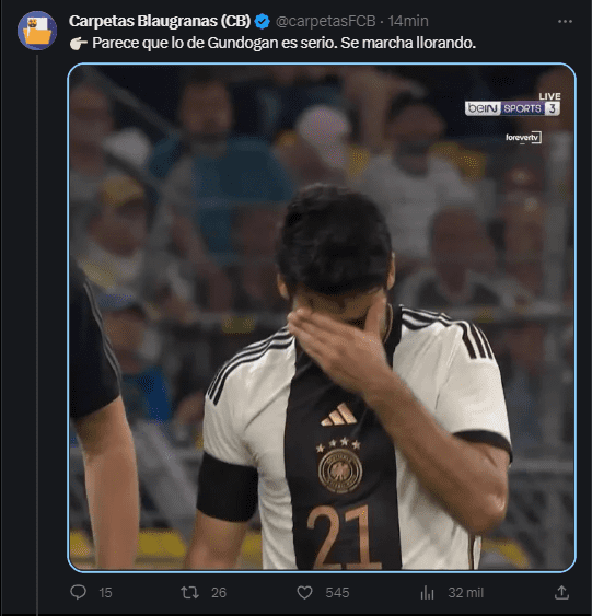 Hoy están jugando y jugarán seis futbolistas del Barça. Y en un mismo encuentro están tanto Jules Koundé de Francia que juega contra la Alemania de Marc-André ter Stegen e Ilkay Gündogan. Y es justamente este último quien se habría retirado del encuentro con molestias y con una visible tristeza, una de las peores noticias para Xavi Hernández y para todo el barcelonismo.