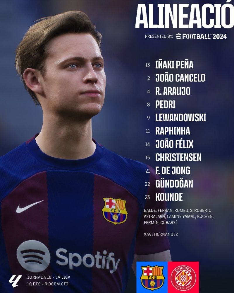Es por ello que el 11 inicial del Barça para recibir al Girona es el siguiente: Iñaki Peña estará en la portería; el lateral derecho será Jules Koundé, mientras que el capitán Ronald Araújo y Andreas Christensen estarán en la zaga central y con Joao Cancelo a su izquierda; Ilkay Gündogan será el pivote y alternará posición con Frenkie de Jong, mientras que Pedri irá más suelto como interior; el triplete de ataque es el de siempre, con Raphinha por el extremo derecho, Joao Félix por el izquierdo y Robert Lewandowski como referente en el centro.