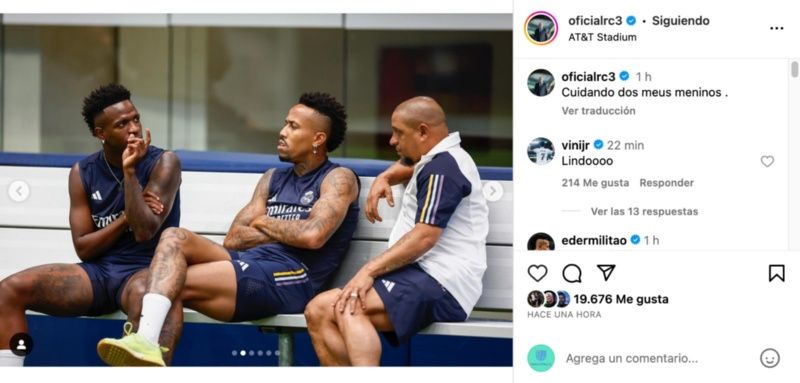 Roberto Carlos, legendario lateral izquierdo del Madrid y de la selección de Brasil, ha tenido que acercarse a la concentración del elenco madridista para subirle los ánimos a sus dos compatriotas, Vinicius y Éder Militao, porque tuvieron un encuentro desastroso y estaban bajos de moral. “Cuidado con mis chicos”, fue la imagen que colocó en sus redes.