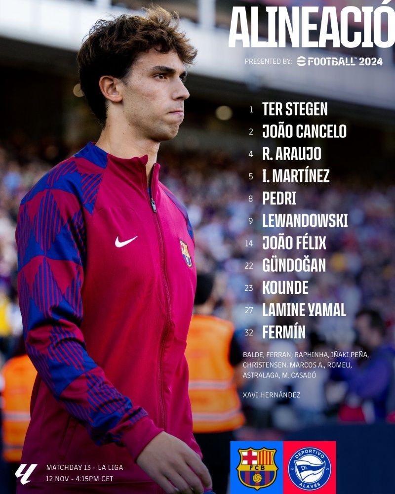 Con este contexto, este es el 11 del Barça ante el Alavés: Marc-André ter Stegen en la portería y como capitán; Ronald Araújo estará de lateral derecho, Jules Koundé e Íñigo Martínez serán los centrales, mientras Joao Cancelo irá por izquierda; Ilkay Gündogan será el pivote esta tarde, acompañado por Pedri y Fermín López como interiores; y el tridente ofensivo será el mejor de la temporada con Lamine Yamal por derecha, Joao Félix por izquierda y Robert Lewandowski como centro delantero.