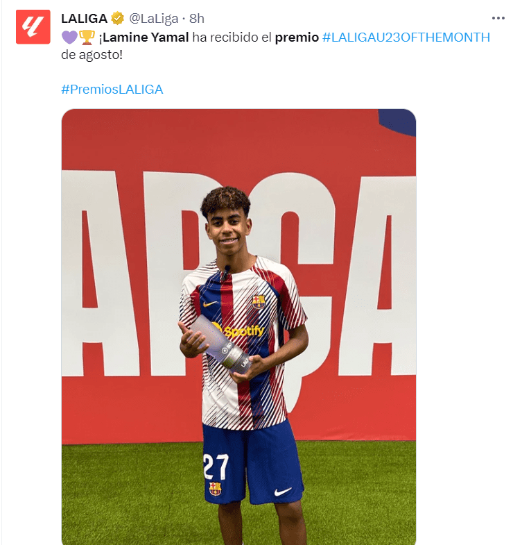 Con la camiseta del FC Barcelona Lamine Yamal acumula 5 partidos disputados en la presente temporada, totalizando dos asistencias y la asombrosa cifra de 260 minutos en la presente campaña, números que le han situado y justificado como merecedor de este galardón individual en la temporada que recién comienza para el y su club.