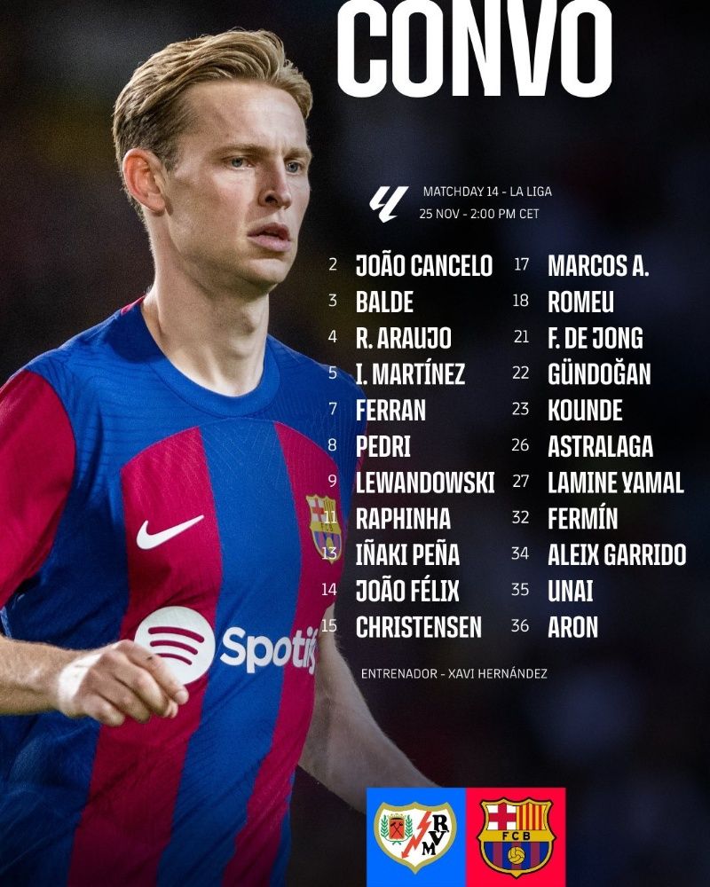 El FC Barcelona visita el Estadio de Vallecas para enfrentarse ante el Rayo Vallecano por la jornada 14 de LaLiga EA Sports y en un panorama nada favorable. El equipo ha sufrido dos bajas muy claras y notorias de cara al encuentro de hoy, tanto la de Gavi como la de Marc-André ter Stegen, y Xavi Hernández tendrá que hacer varios ajustes para reemplazarlos a cada uno. De hecho, Iñaki Peña tendrá la rara oportunidad de empezar un partido tras la lesión del portero alemán, que también dará la oportunidad de ser capitán a otra figura.
