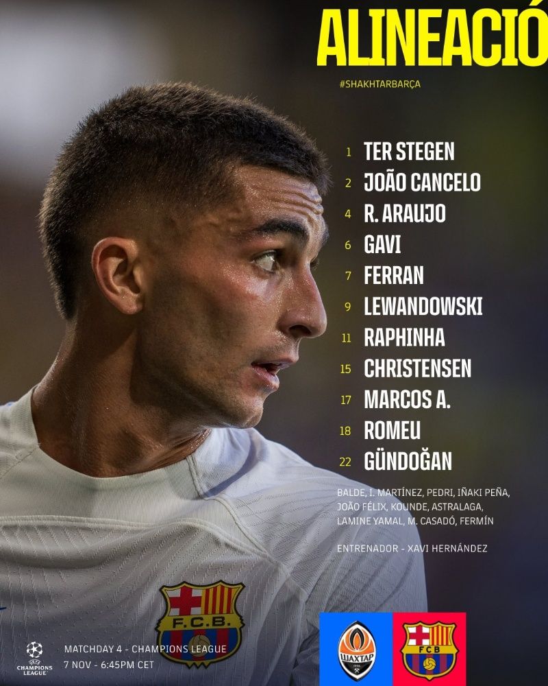 Con este contexto, el Xavi pondrá este 11 para enfrentar al Shakhtar: Marc-André ter Stegen será el portero y capitán; la línea de cuatro defensores estará compuesta por Joao Cancelo, Ronald Araújo, Andreas Christensen y Marcos Alonso; Oriol Romeu será el pivote, mientras Gavi e Ilkay Gündogan serán los mediocampista interiores; y el tridente ofensivo estará formado por Raphinha y Ferran Torres en los extremos, y Robert Lewandowski de único delantero punta.